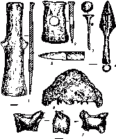 Представляют интерес находки серебряной поясной пряжки VI-VII вв. в верхнем слое заполнения ямы скифского времени и лепного горшка пеньковской культуры, стоявшего в небольшой ямке (рис. 2, 5). Обнаружены предметы, относящиеся к черняховской культуре : обломки керамики, железный наконечник дротика, нож (рис. 1, 4-5). Из находок скифского времени отметим обломки глиняного жертвенника в яме № 2/11. Один из фрагментов украшен вдавленной круговой бороздкой (подобный фрагмент найден и в заполнении жилища № 1 на раскопе XVI). Редкими находками являются тесловидное железное орудие с боковыми выступами и зубило с проухом (рис. 1, 1, 2). Находки датируются VI-V вв. до н.э., за исключением архаического фрагмента чернолощеной миски VII в. до н.э. со штампованным орнаментом.