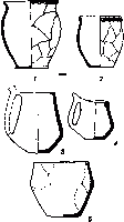 Рядом с “очагом”, на полу, покрытом глиняной обмазкой, находился круглый в плане жертвенник, слегка возвышавшийся над уровнем пола и украшенный по краю тремя концентрическими валиками и бороздками (сохранилась часть жертвенника). Поверхность его носила следы побелок и воздействия огня. Недалеко от жертвенника, но уже, видимо, за пределами жилища – небольшая ямка, забитая обломками глиняных лепешек. Жилище погибло в огне пожара внезапно. В наземной его части, под завалом стен, сохранились в целом состоянии или в развалах примерно 14 лепных сосудов (горшки, черпаки, миски, корчага) и гончарный серо-глиняный кувшин ольвийского производства (рис. 2, 1-4). Комплекс находок можно датировать концом VI или самым началом V в. до н. э.