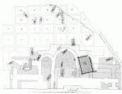 Под южной апсидой Десятинной церкви и частично за ее пределами раскопками Д.В.Милеева в 1908 г. было открыто деревянное сооружение, назначение которого осталось тогда невыясненным. Та часть сооружения, которая выходила за пределы габаритов храма и которая благодаря этому подверглась меньшему разрушению при закладке в конце Х в. фундаментов храма, была исследована с особенной тщательностью. Сооружение (рис. 24) представляло собой сруб из сосновых, сильно истлевших бревен, рубленных “в обло”, сложенный в глубокой грунтовой выемке, вырытой в лёссовом материке. Местами (например, в северо-западном углу) сохранились три венца сруба, в остальной части лишь нижний венец. Сруб имеет квадратный план (5.5:5.5 м); выемка, в которую он опущен, несколько больше. На плане восточной части Десятинной церкви, вскрытой раскопками 1908 г., в южной части сруба показано бревно, лежащее параллельно южной стенке, а западным концом как будто бы врубленное в западную стенку сруба. В достаточно подробном отчете Д.В.Милеева о раскопках 1908 г. об этой детали постройки, к сожалению, не упомянуто.