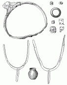 Изучение состава находок, обнаруженных на этом участке, позволяет до известной степени реконструировать этот интересный разрушенный комплекс. В погребальном кострище сохранились следующие вещи: [с. 196]