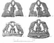 Аналогичные костяные накладки с выступом в виде головы хищной птицы, покрытые глубоко врезанным плетеным орнаментом, найдены в Шестовицком могильнике.