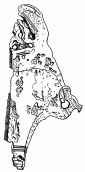 Северо-восточная часть могилы была нарушена кладоискательской ямой. Найденные здесь человеческие кости и отдельные предметы лежали в полном беспорядке. По мнению Н.Ф.Беляшевского, кости в этой части могильной ямы принадлежали, по-видимому, трем погребениям. В северном углу ямы под черепом лежала железная шпора (рис. 38), а возле нее окислившийся железный [с. 193] предмет, по-видимому, подковка от сапога. В этой же части ямы найдена бронзовая фигурная ручка от железного кресала со скульптурными изображениями двух птиц, клюющих голову стоящего между ними человека (рис. 39). В средней части могилы найден миниатюрный стеклянный сосуд (рис. 38).