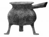 Упомянутый бронзовый котелок, или курильница, позже был приобретен в коллекцию Ханенко [Древности Приднепровья, вып. VI, Киев, 1907, стр. 42 и табл. XXXIX]. Он представляет собой массивный литой сосуд на трех ножках с ручкой в виде втулки, в которую вставлялась деревянная рукоять (рис. 41).