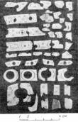 1. Большое количество мелких, поломанных и подвергшихся действию огня костяных пластинок (накладок), украшенных орнаментом из кружочков с точкой посредине в различных композициях (рис. 42).