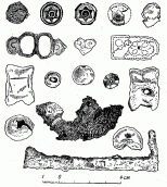 Кладоискательский раскоп, к счастью, разрушил не все погребение. Юго-западная сторона могильной ямы оказалась нетронутой. Здесь, очень близко к стенке ямы, лежал скелет с вытянутыми вдоль туловища руками и ногами, головой на ЮВ. У левой руки его находились три крупных разноцветных пастовых бусы и бронзовая пуговка. Большое количество разнообразных предметов найдено возле ног скелета. У ступни правой ноги лежала железная шпора (рис. 38), парная к той, что найдена в северо-восточной части могилы. Тут же лежало бронзовое литое кольцо (рис. 38). Под правой ступней найдена костяная пластина, сделанная из распиленного вдоль лосиного рога (рис. 40). Пластина имеет форму неправильного треугольника, один из углов которого обработан в виде стилизованной головы птицы с клювом и большим круглым отверстием на месте глаза. Поверхность пластины почти сплошь изрыта выщербинами, среди которых лишь кое-где видны следы врезанных линий. Однако восстановить рисунок уже нет возможности.