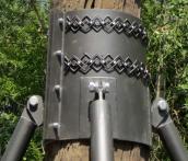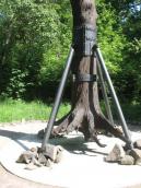 Металева платформа, що у вигляді диску лежала на поверхні грунту, слугувала базою конструкції. Чотири трубчастих металевих опори, що нижніми кінцівками кріпилися до основи болтами ( Фото 27а, б), утримували пам’ятку у вертикальному положенні. Широка металева муфта слугувала поясом для фіксації опор зверху (Фото 28). Тонка декоративна муфта, що додатково обіймала стовбур, стримувала його лінійне розширення по горизонтальній вісі.