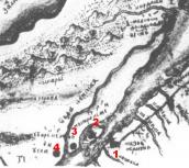 Рис. 6. Таванські фортеці за станом на 1685 рік: 1 – Кизи-Кермен, 2 – Мустріт-Кермен, 3 – Мубарек-Кермен, 4 – Іслам-Кермен. Карта орієнтована на південь.