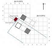 Позначивши на малюнку гіпотетичні обриси будинку за його північно-західним кутом (синя лінія), ми бачимо, що обриси будинку перекриваються комплексом із чотирьох фундаментів (мал. 11).