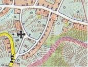 | Мал. 3. Супутниковий знімок замчища (Google maps) | Мал. 4. Фрагмент туристичної топографічної карти. Помітно узвишшя у південній частині замчища, перерізане сучасними вулицями |