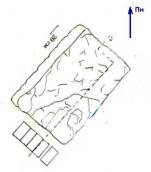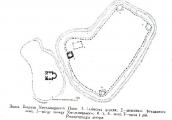 | Мал. 9. Кам’яні фундаменти і погріб [74] | Мал. 10. План замчища-садиби Б. Хмельницького в Суботові з позначенням місць розкопок [75] |