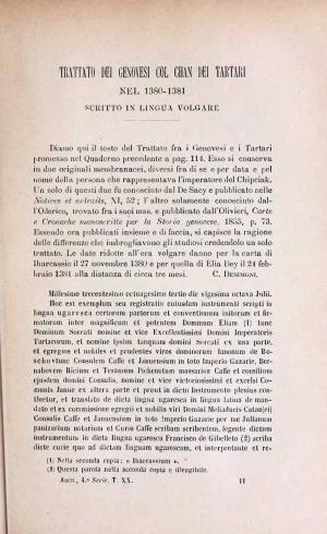 Попри понад ніж двохсотрічну історію політичних взаємин між генуезцями й Улусом Джучи та його наступником, Кримським ханством, документальних свідчень цих стосунків залишилося досить небагато. Тому особливий інтерес викликають два генуезько-ординські договори, датовані за мусульманським літочисленням 30 шабана та 27 зу-ль-када 782 року гіджри. Першим їх згадує у своїй роботі «Лігурійські листи» (1792 р.) абат Гаспаре Луїджі Одеріко [Oderico 1792: 180-181]. Дослідники ХІХ століття обмежувалися, головним чином, стислими коментарями під час публікації текстів чи в оглядових працях (De Sacy 1827, Olivieri 1855, Desimoni 1867, Belgrano 1872: 171, Брун 1879: 224-226, Heyd 1886: 205-207, Desimoni 1887), порівняно докладний розгляд положень цих договорів міститься у розвідках Гейзи Кууна [Kuun 1873: 22-49] та Василя Смірнова [Смирнов 1887: 132-138].