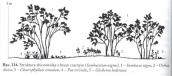 Рис. 3. 132. Схема утворення синантропних рослинних угруповань: 1 – природне угруповання, 2 – площа вільна від рослин після знищення природної рослинності людиною, 3 – на вільну площу проникають апофіти та антропофіти, 4 – апофіти та антропофіти утворюють нове угруповання, а – характерний первинний склад рослинності, b – апофіти, c – антропофіти, d – напрямки проникнення рослин, е – фітосоціологічні зв’язки, за (Wysocki, Sikorski, 2009)