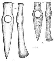Останнім часом до археологічної спадщини Волині долучилося чимало нових палеометалевих виробів. З виявлених артефактів до більш раннього періоду належать три мідні сокири з отвором, одна з яких знайдена у Млинівському районі, друга – Дубнівському районі Рівненської области, третя походить з околиць смт. Торчин Луцького району Волинської области. Вона зберігається у фондах Волинського краєзнавчого музею (А – 11496). Форма її видовжена, поверхня зерниста, робоча частина загострена (рис. 1). Довжина сокирки – 17 см, ширина – 5 см; отвір для руків’я має діяметр 2,8 см (рис. 2, 2). Сокира з Млинівського району дещо більша та увігнутіша, має довжину 25 см, ширину – 5,5 см, а просвердлений отвір – 3 см (рис. 2, 1).