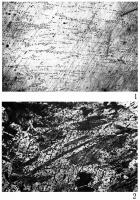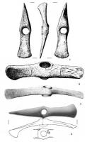 Шліф для проведення металографічного дослідження зроблено на поздовжньому перетині горизонтального леза. До протравлення на поверхні шліфа спостерігається евтектика Cu-Cu2O, яка в процесі лиття сконцентрувалася на межах зерен (рис. 5, 1). Характер розташування евтектики свідчить про те, що виріб було вилито у формі з низькою теплопровідністю, а потім проковано зі ступенем сумарного обтискування 80 – 90 %. При цьому форма, скоріше за все, розігрівалася перед заливанням металу. Не можна відкидати й перегрівання металу [Там само. – С. 16.]. Кування було направлене на витягування леза без його холодного зміцнення (рис. 5, 2). Величина зерна 0,15 – 0,20 мм. Мікротвердість від краю леза коливається від 80,3 кг/мм2 до 71,3 кг/мм2. Невелике збільшення твердости металу на краю леза набуто в процесі використання знаряддя.