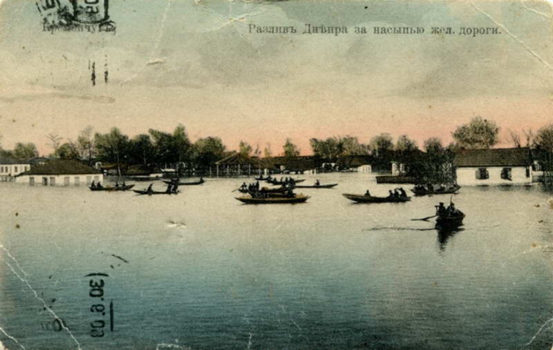 Dnieper flooding near embankment of the railway. The left bank of the Dnieper – probably the Lower Kuhmister Slobodka. Postcard of beg. XX century. |