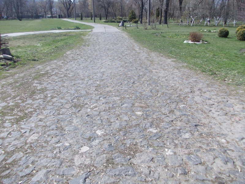Бруківка на Трухановому острові (база Зеленбуду), що веде до кам’яної греблі впоперек протоки. Фото Івана Парнікози, 2014 р. |